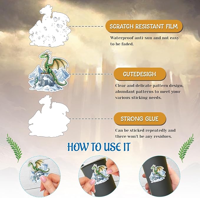 - Dragon Stickers: Dragon stickers are printed with various dragon, rich and mystery. Children can make cards or other gifts for friends with different dragon stickers, which can improve kid’s creative abilities. The dragon decor can be applied to laptops, backpacks, desks, suitcases, books, water cups, and more, which will surely elevate your visual experience and bring a touch of joy to everyday items