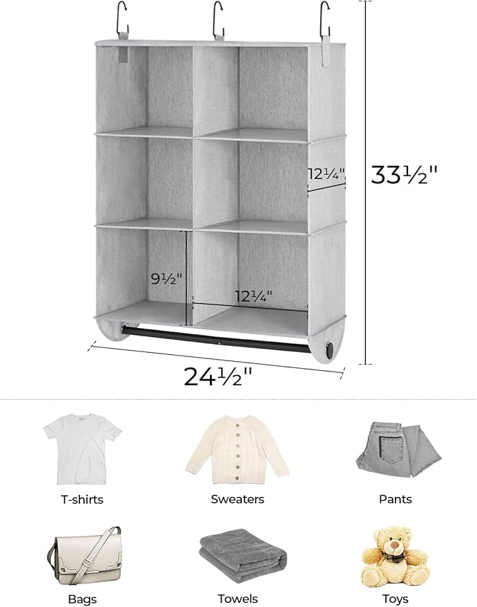 - Space-Saving Design: Measuring 12¼" D x 24½" W x 33½" H, this closet hanging organizer features 6 spacious compartments that maximize vertical space and keep folded clothes neatly stored.