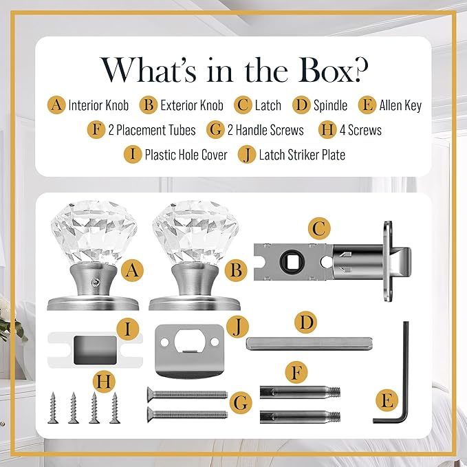 - ๐๐๐๐จ๐ซ๐ญ๐ฅ๐๐ฌ๐ฌ ๐๐ง๐ฌ๐ญ๐๐ฅ๐ฅ๐๐ญ๐ข๐จ๐ง โ Includes everything needed: silver base knob set, spindle, latch, striker plate, screws, and placement tubes. No complicated tools requiredโjust easy style and functionality.