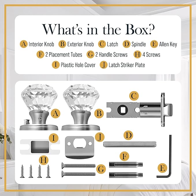- ๐๐๐๐จ๐ซ๐ญ๐ฅ๐๐ฌ๐ฌ ๐๐ง๐ฌ๐ญ๐๐ฅ๐ฅ๐๐ญ๐ข๐จ๐ง โ Quickly assemble the crystal door knob set with everything included: interior & exterior knob, spindle, latch, striker plate, screws, Allen key, placement tubes, privacy plunger, and instructions. Whether you're installing cool door knobs, vintage style door knobs, silver crystal door knobs interior, or crystal door pullsโsetup is simple and stress-free.