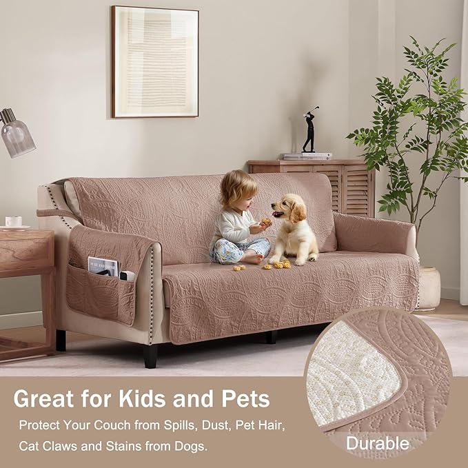 - Coin Medallion Quilting Designed Pattern: adding a refined modern taste to your living room decor with this loveseat cover, it is an elegant coin medallion embossed pattern, made with a pinsonic heat pressed technology that without threads, resulting in sleek and visually appealing slipcovers; that creates a stronger and more durable couch cover, protecting your loveseat couch from spills, dust, pet hair, cat claws and stains from dogs