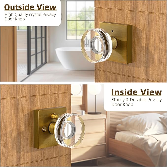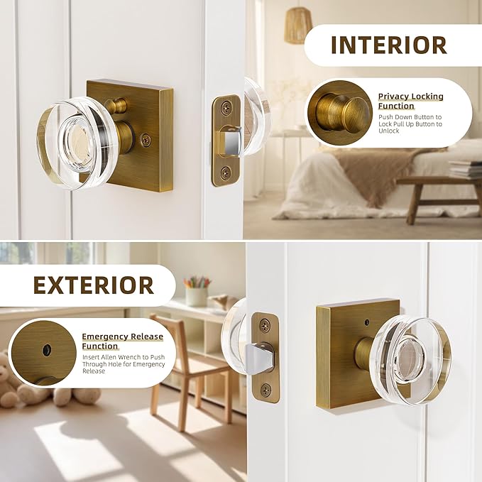 - 【Emergency Release Function】The crystal door knobs can be locked using the thumb button function from inside, and be unlocked from the outside with privacy key in emergency