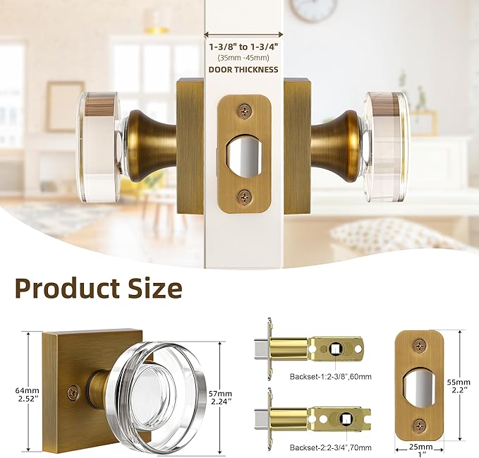 - 【One Size Fits Most】The crystal door knobs interior fit for door thickness from 1-3/8" to 1-3/4"(35-45mm), adjustable latch 2-3/8" or 2-3/4"(60 or 70mm). Suitable for most standard doors