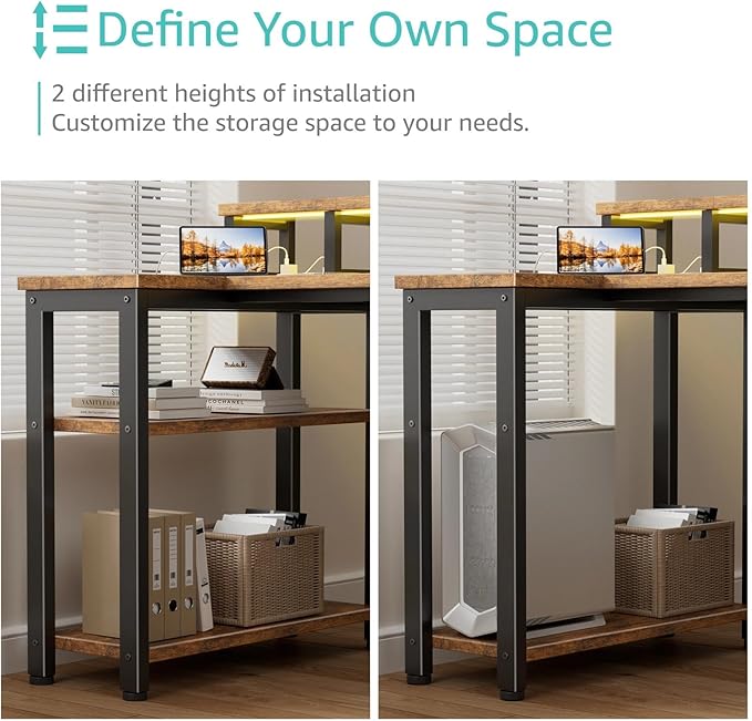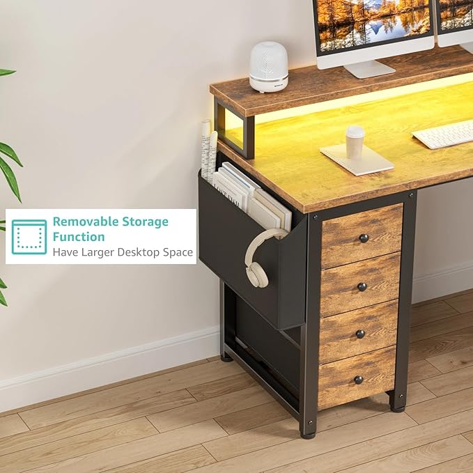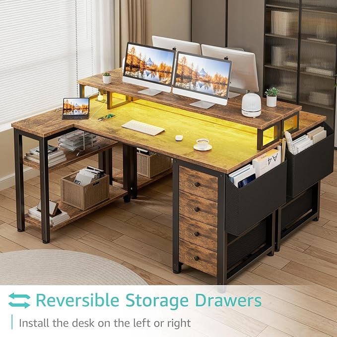 Lufeiya L Shaped Gaming Desk with Led Lights and Power Outlets, 47 Inch Corner Home Office Desk with Monitor Stand Shelves, Writing Study Computer Desks with Fabric Drawers for Bedroom, Rustic Brown