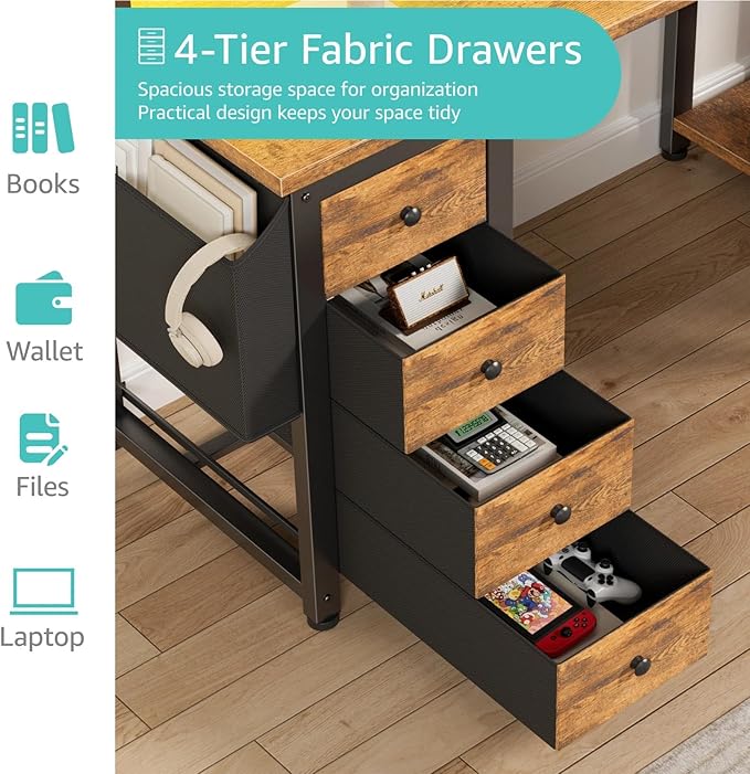 - Working Desk with Ample Storage Options: Computer desk with 2 storage shelves and 4 𝙁𝙖𝙗𝙧𝙞𝙘 𝘿𝙧𝙖𝙬𝙚𝙧𝙨, you can try this two installation methods (left or right), and the shelves have two different heights of installation, you can customize the storage space to your needs. It also have one side storage bag, perfect for holding magazines, notebooks, bags or small electronics