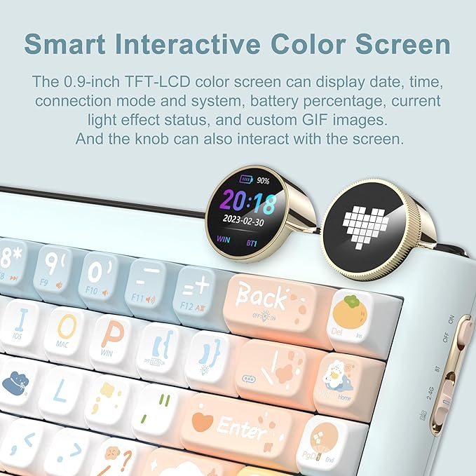 - 【Display Screen and Knob】FOPATO D68 mechanical keyboard is equipped with a 0.9-inch TFT-LCD smart interactive color screen, which can display time, connection mode, percentage of illuminated icons, system switching, and custom GIF images. There is also a knob for adjusting multimedia volume, which can quickly switch connection modes. The knob can also interact with the screen, bringing more fun.