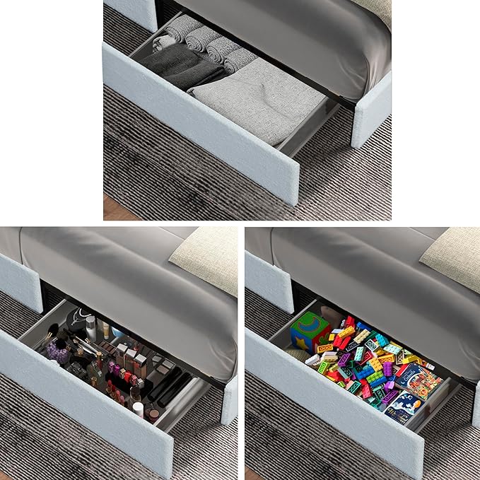 - 【Drawer System】Equipped with two spacious, plastic-lined under-bed drawers that can each support up to 40 lbs. The drawers measure 29.5" x 19.3" x 5.9" and are dust-proof, easy to clean, and perfect for storing bedding, clothing, gadgets