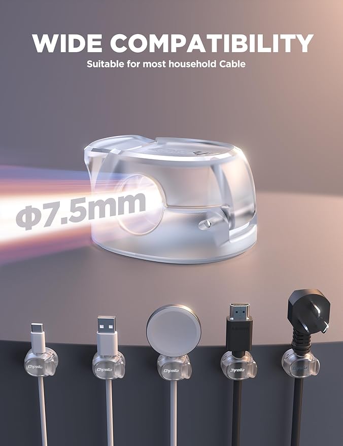 - ✅【Wide Compatibility】Chfeila cord holder for nightstand are designed to accommodate a wide range of cable types. With a 0.3-inch (7.5 mm) slot, these versatile clips can effortlessly manage phone charging cables, USB cords, HDMI cables, computer power cords, and more. Whether you're organizing your home office, bedroom, or car, Chfeila cord management have you covered.