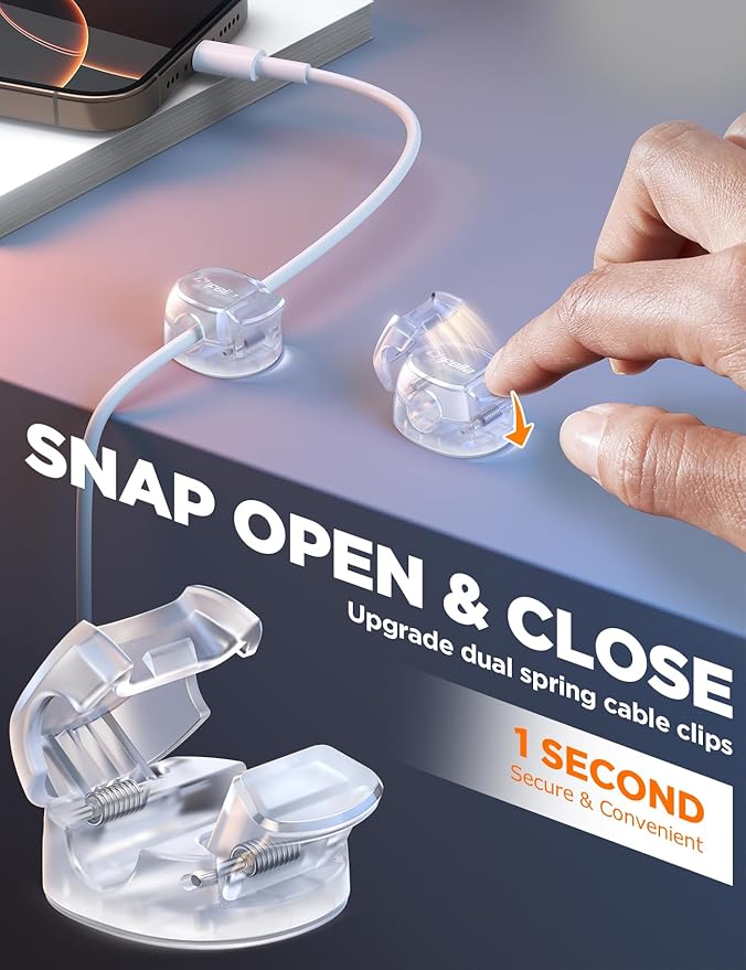 - ✅【Never Be Pulled Apart, Snap Open & Close】Chfeila's charging cord holder are a game-changer in cable management. Our revolutionary dual spring and clasp design ensures that your cables stay securely in place, no matter how much tugging or pulling they endure. The ingenious snap-open, soft-press mechanism makes adding or removing cables a breeze, providing a seamless user experience. Say goodbye to tangled cords and accidental disconnections that disrupt your workflow or relaxation time.