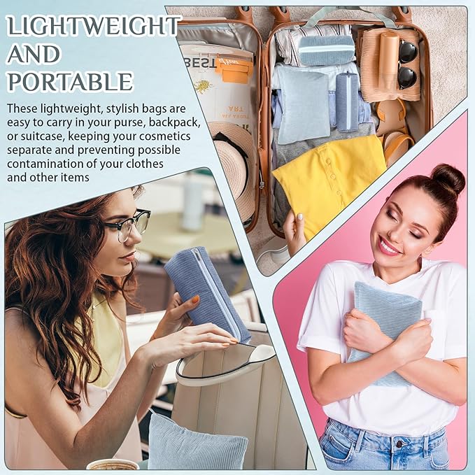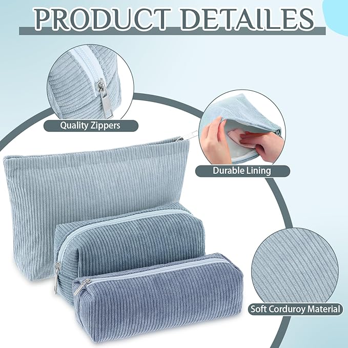- Material and Attractive Design: the makeup and toiletry travel bag set is mainly crafted from quality corduroy material, ensuring high durability and prolonged service life; The bags feature an adorable and delicate design with scattered cute smiling faces in different sizes on the blue color surface; This makes them compatible with various styles of outfits