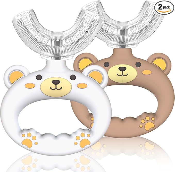 Toddler U Shape Toothbrushes for Baby Age 1 2 3 4 5, 360° Oral Teeth Cleaning Design with Food Grade Soft Silicone Brush (White&Brown)