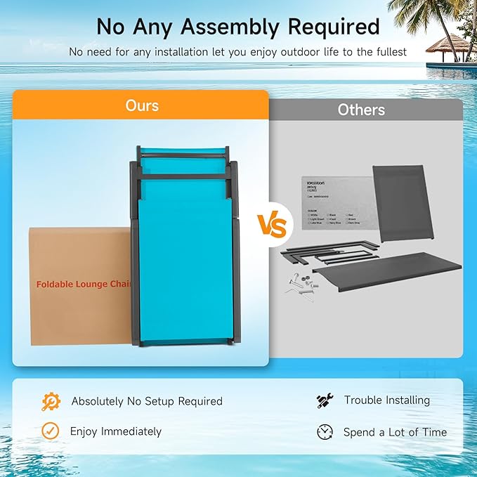 - Truly No Assembly: Unbox and enjoy immediately with ease! Say goodbye to annoying setup or folding. No extra accessory needs to be installed, the chaise lounge chair outdoor ensures truly assembly-free use. For stability, rest assured that the thickened tube walls provide strong support