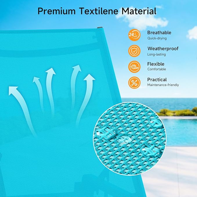- All Seasons Available: Crafted with premium Textilene fabric, our outdoor chaise lounge is weather-proof and quick-drying for all-season use. Good flexibility and breathability are provided to keep you cool on hot days. Cleaning is a breeze, just wipe with damp cloth to get easy maintenance and ultimate comfort