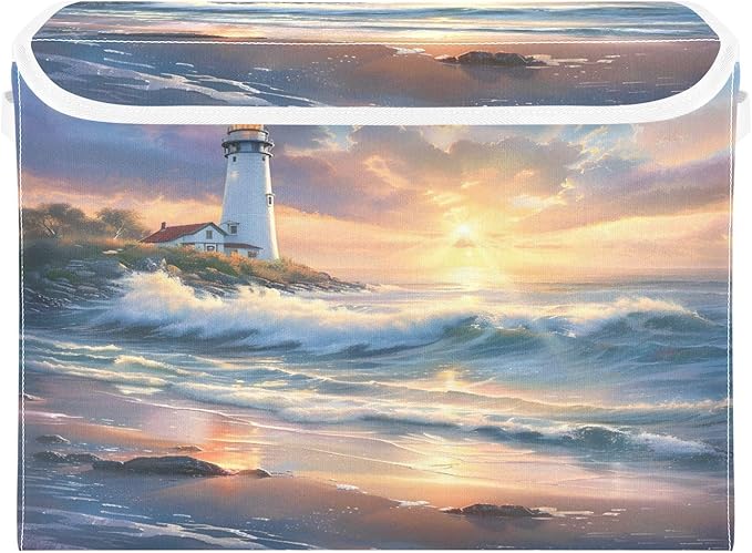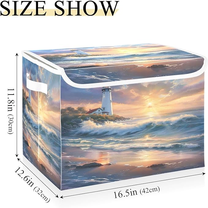 senya Large Storage Bins with Linen Collapsible Foldable Storage Cubes Fabric Closet Organizer Containers box with Flip-Top Lid for Home Bedroom Office 16.7 x 12.6 x 11.8in (Seaside Scenery)