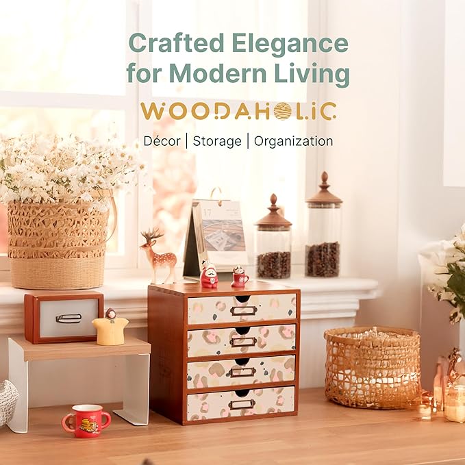 - Add a contemporary flair with a leopard print-inspired design: Bring bold sophistication to your workspace or home with this 4-drawer organizer. The modern, abstract leopard print pattern features organic spots in earthy tones and soft pinks, creating a striking yet versatile aesthetic that pairs beautifully with the rustic wooden base.