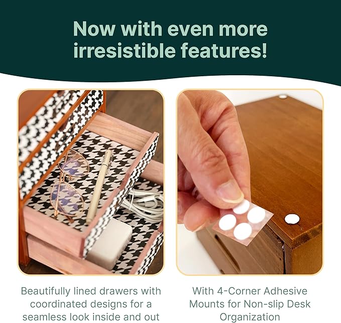 - Add a sophisticated flair with houndstooth pattern: Bring a touch of timeless elegance to your workspace or home with this 4-drawer organizer. The bold, black-and-white design offers a striking contrast to the rustic wooden base, making it a chic and functional addition to any room.