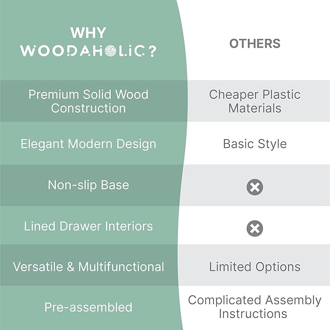 - Woodaholic Brand Promise: At Woodaholic, we combine timeless design with thoughtful functionality, offering quality-crafted solutions that enhance your home and last a lifetime.