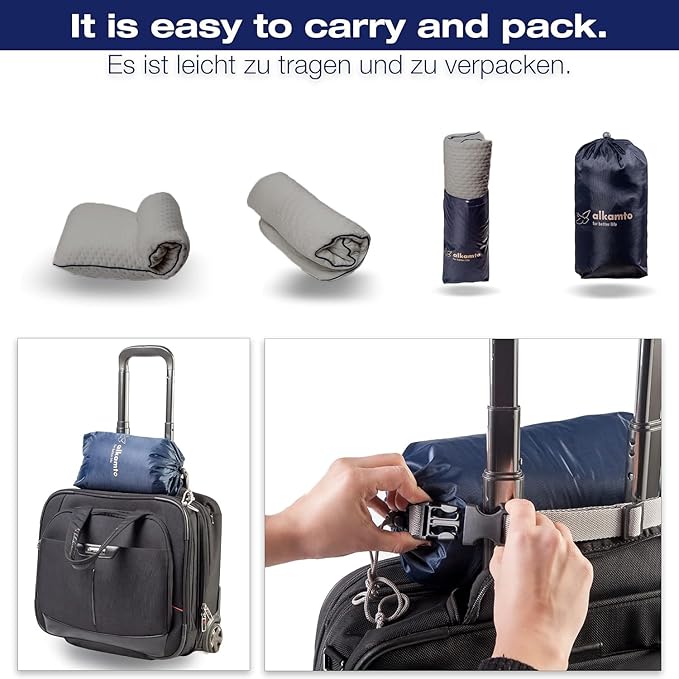 - ✔ LIGHT & EASY TO PACK - Easy to carry pillow around for all kinds of trips (like camping / fishing / backpacking / hiking / beach / festival) its lightweight design and travel case. Compressible and self-inflatable, easily be fitted inside its compact and small travel bag and rises up to its full shape once taken out in a matter of seconds. Ideal to take on airplanes, trains and cars or for outdoor activities along other camping gear, hiking and travelling accessories.
