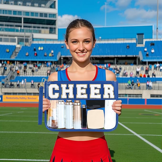- DESIGN FEATURES: Clear PVC cheer makeup bag with navy blue trim and white chenille 'CHEER' lettering on the front, perfect for organizing cosmetics and accessories