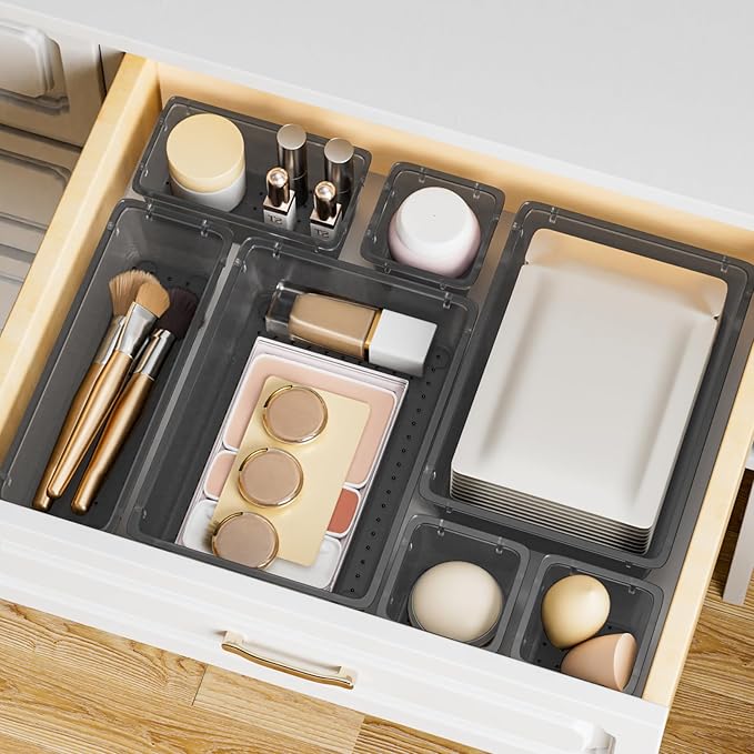 15 PCS Clear Plastic Drawer Organizer Set, 4-Size Acrylic Drawer Storage Trays, Storage Bins for Makeup, Gadgets, and Jewelry in Bathroom, Bedroom and Office, Clear Black