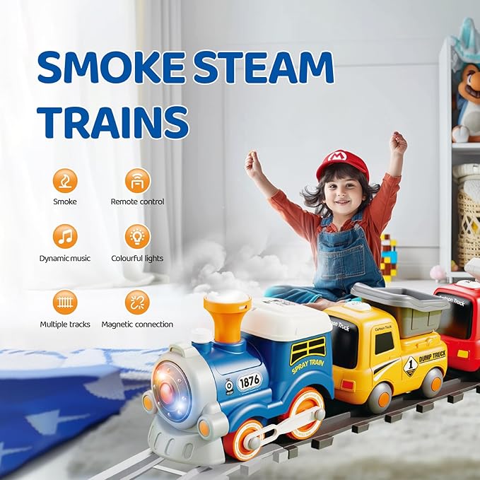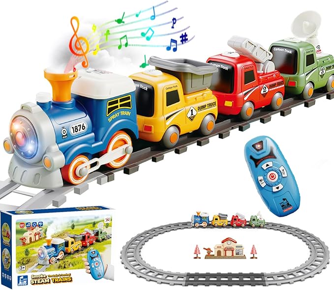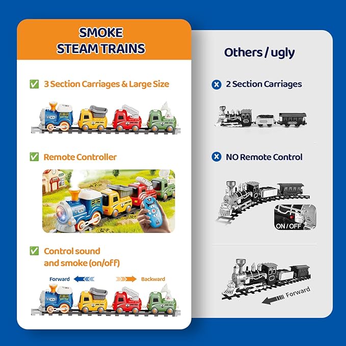 - REALISTIC SOUND,ODORLESS SMOKE, COOL HEADLIGHT : When the Christmas train set run, it produces authentic train sounds, working headlights and realistic smoke to make the game process more exciting and funny; Also the train sets for boys 4-7 comes with a bonus-empty water bottle, you have to put water into it and will emit harmless smoke, not like others emit an odorous smell by putting oil, which is safer for your kids; A fun train toy for boys is perfect for 3 4 5 6 7 year old boys