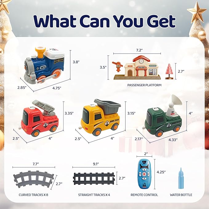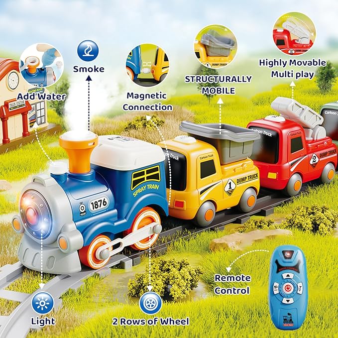 - TRAIN PACKAGE INCLUDES: Locomotive *1 / Engineering vehicle *3/ Trees *2 / Railway station *1 / Curved track *8 / Straight track *4 / Color packaging. Remote control train can go forward/backward/stop and start/sound and water mist, so that the train has more playability, your child will love to watch the toy train set of boys 2-4 move; Not only will you get your kids to play for hours, but you'll also improve their intelligence and work on hand-eye coordination