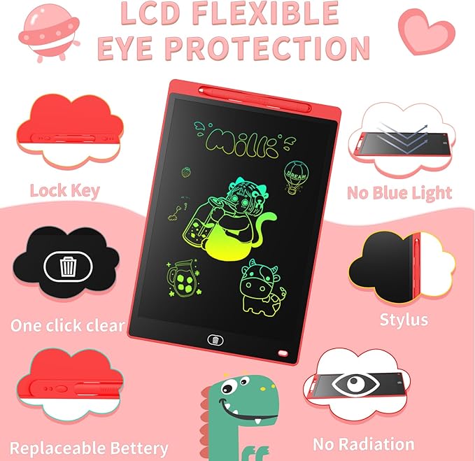 - ★EDUCATIONAL TOYS FOR CHILDREN★ LCD graphic tablet with colorful display, very clear writing, provides enough space for drawing and graffiti, frees children's imagination and stimulates children's creativity! LCD display has no blue light, glare, radiation and protects the eyes from long-term use to cause damage to children's eyes! It is a good partner for children!