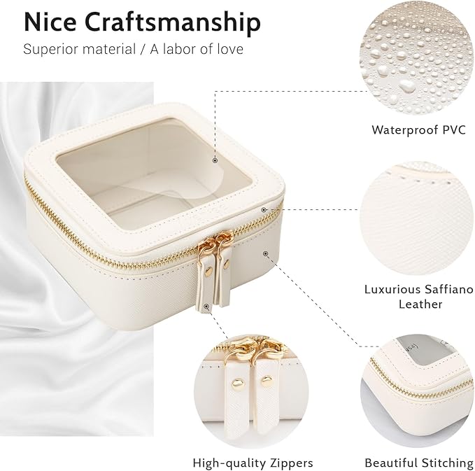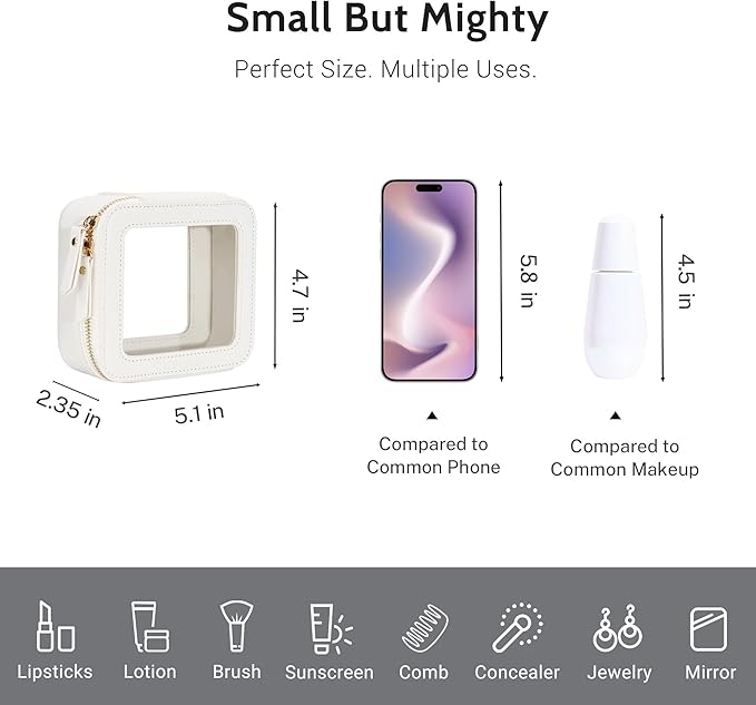 - LUXURY DESIGN –This mini cosmetic case (5.1’ x 4.8’ x 2.35’) features high-quality saffiano PU leather and thick vinyl for a sturdy, stylish structure. With polished hardware, whisper-quiet zippers, and minimalist boxy design, it’s the ideal small makeup bag for purse or clear makeup bag.