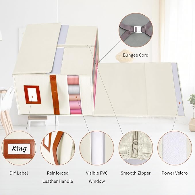 4 Pack Large Bed Sheet Organizer, Foldable King Queen Sheet Organizers and Storage with Oxford Fabric, Clear PVC Window & Leather Handle – Sheet Storage Set for Blankets, Duvet Cover Set
