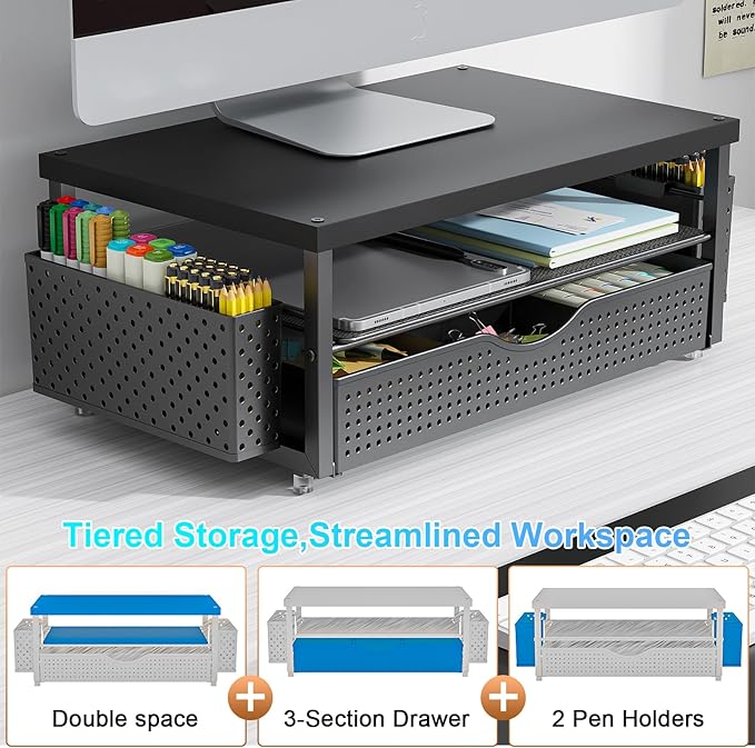 - 【Organized Storage】This desk monitor stand/organizer features two tiers of storage for files and notes. Equipped with two pen holders and a drawer , it effortlessly organizes pens, scissors, and other desk essentials, keeping everything within reach.