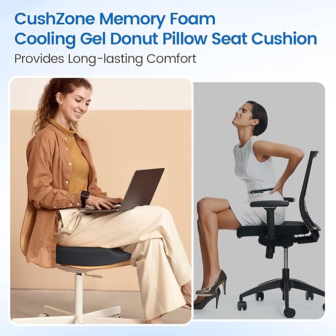 - [Premium Memory Foam & Cooling Gel]: CushZone donut pillow floor cushion measures 18.5" x 14" x 3.5". Made with premium high density memory foam and cooling gel, CushZone donut pillow seat cushion effectively provides support and stays cool even after prolonged use The gel layer efficiently dissipates heat, ensuring a comfortable seating experience