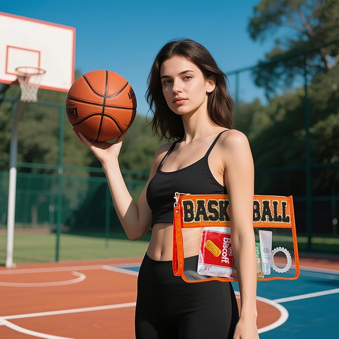- DUAL PIECE SET: Includes a large clear makeup bag with basketball lettering patch and a small orange cosmetic pouch with basketball design