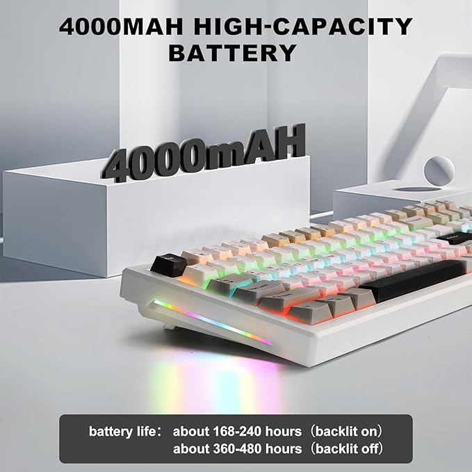 - 【4000mAh Long-Lasting Battery & PBT Durability】 Week-Long Wireless Freedom – 4000mAh battery delivers 200+ hours of backlit runtime (USB-C rechargeable). Double-shot PBT keycaps resist shine and fading, ensuring legends stay crisp through years of heavy use.