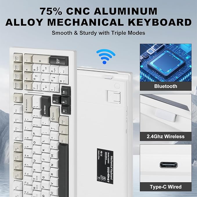 - 【Tri-Mode & Seamless Switching】 Tri-Mode BT5.0/2.4GHz/USB Wireless Mechanical Keyboard – Connect up to 5 devices simultaneously via Bluetooth, 2.4GHz dongle, or USB wired mode. Instantly switch between devices (PC/Mac/Phone/Tablet) with FN+ shortcut keys, ideal for multitasking across work, gaming, and study.
