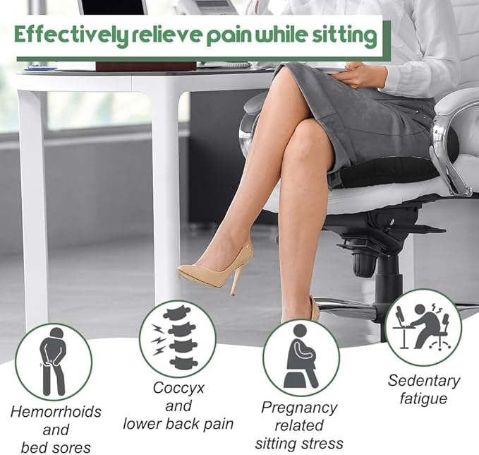- Safe & Healthy Sitting - The seat pillow helps relieve pressure from your back or pelvic region while sitting for extended periods, also an ideal solution for people suffering from hemorrhoids, bed sores, broken tailbones, sciatica, coccyx pain, during pregnancies or post injuries.
