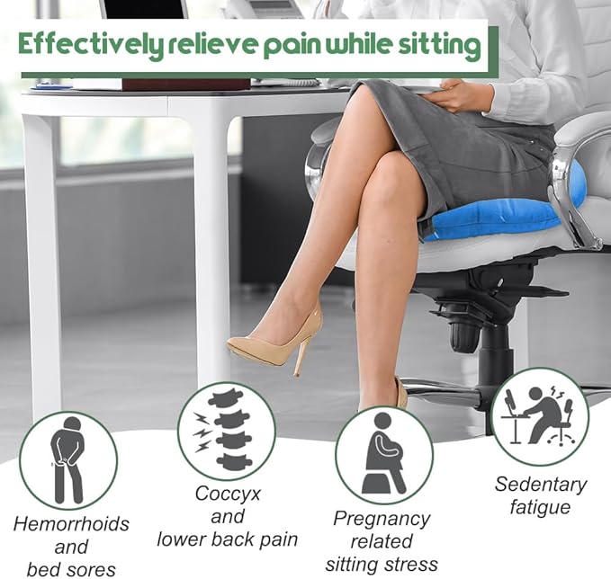 - Safe & Healthy Sitting - The seat pillow helps relieve pressure from your back or pelvic region while sitting for extended periods, also an ideal solution for people suffering from hemorrhoids, bed sores, broken tailbones, sciatica, coccyx pain, during pregnancies or post injuries.