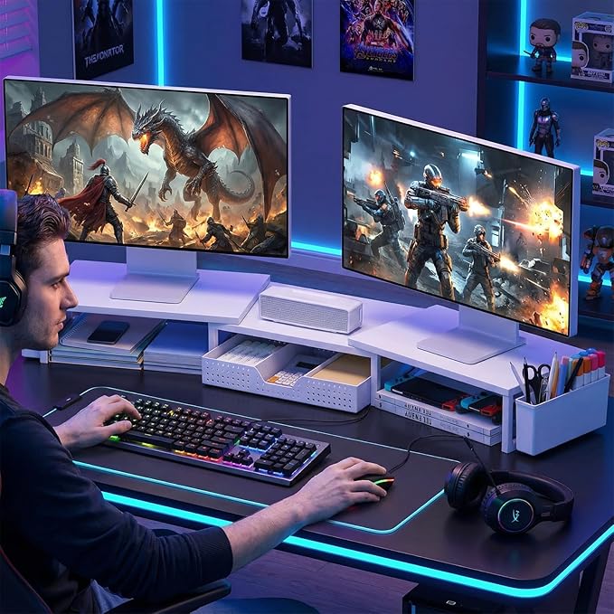 - 【 Dual Monitor Stand with Smart Storage】Clear workspace clutter effortlessly. Organize desk accessories & office supplies in handy 2 hanging pen holders and a drawer. Keep essentials visible and instantly accessible for better focus and efficiency