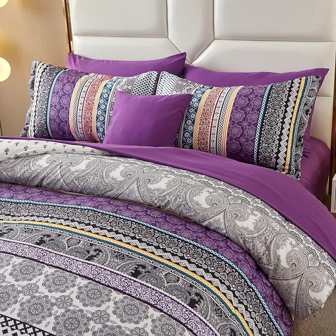 Boho Comforter Set California King Size,8 Piece Bed in a Bag Bohemian Striped Bedding Quilt Set,Purple Paisley Floral Comforter and Sheet Set,Soft Microfiber Complete Bedding Sets for All Season