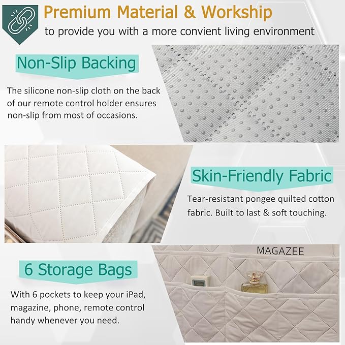- 【EASY TO INSTALL & NON-SLIP】 Our arm chair caddy for recliner is machine washable. Put the end of remote control holder under the sofa cushion, and then pass the other end around the sofa armrest so that the hand can just get the contents of the pocket, the bedside caddy organizer will never slide off with the end pressed.