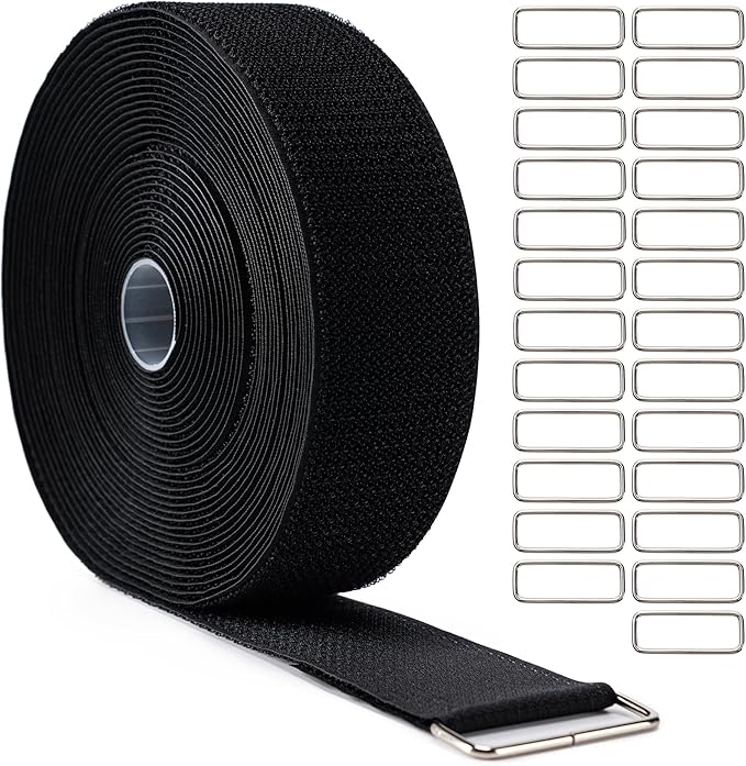 2" x32Ft Hook and Loop Straps Cinch Straps Heavy Duty with 25 Metal Buckles, Adjustable Fastening Cable Straps, Free Cut Length, Reusable Nylon Cable Ties for Organizer or Storage, 2 inch Wide Black