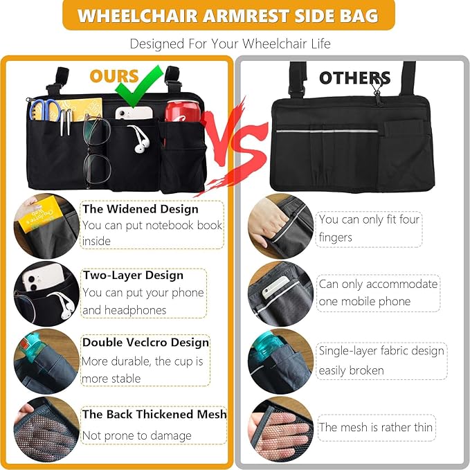 - Upgraded Cup Holder: Wheelchair Bag can hold cups of different sizes, pocket with elastic band that you can put bottle straight. Don't worry about the spills