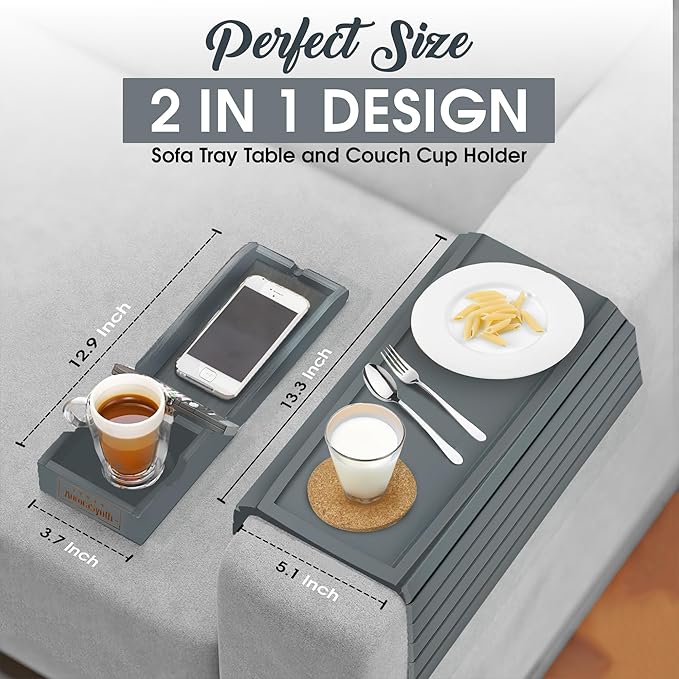 Couch Cup Holder Tray with 2 Cork Coasters, Caddy, Anti-Slip Foldable Armrest Sofa Tray, Anti-Spill Holder for Remote, Snacks, Cellphone - Ideal Gift (Grey)
