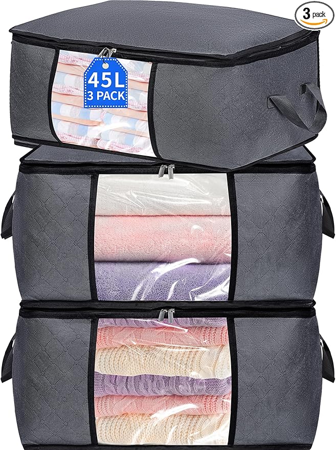 3 Pack Storage Bags, 45L Foldable Clothes Storage Bins with Lids, Closet Organizers Blanket Storage Bags with Zippers Clear Window Sturdy Handles for Clothing Bedding Comforter Sweater Pillows (Gray)