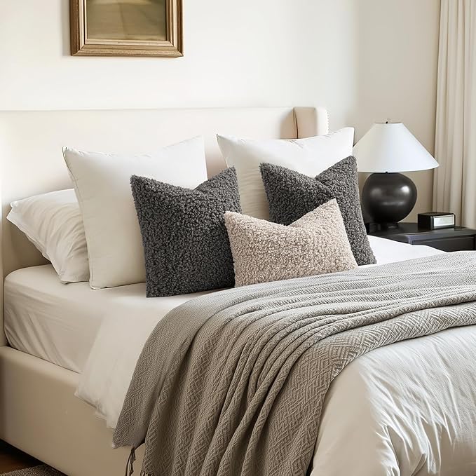 Woaboy Faux Fur Throw Pillow Covers 18x18 Inch Set of 2 Boucle Neutral Decorative Sherpa Fuzzy Accent Soft Sheepskin Fleece Cushions Modern Home Decor for Couch Sofa Bedroom Living Room,Gray