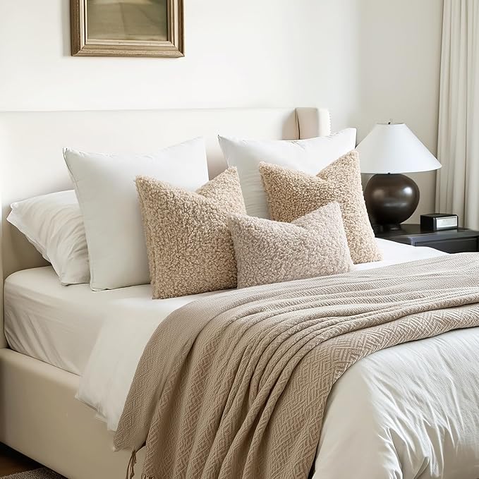 Woaboy Faux Fur Throw Pillow Covers 18x18 Inch Set of 2 Boucle Neutral Decorative Sherpa Fuzzy Accent Soft Sheepskin Fleece Cushions Modern Home Decor for Couch Sofa Bedroom Living Room,Oatmeal
