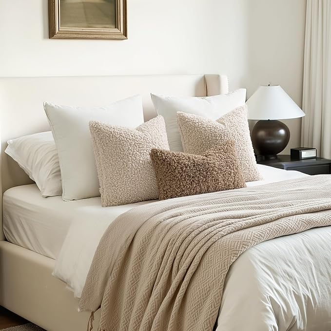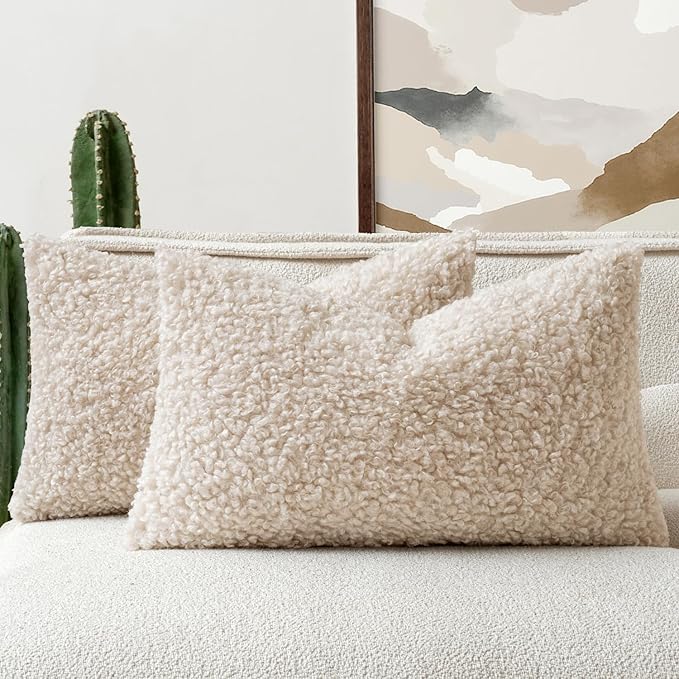 Woaboy Faux Fur Throw Pillow Covers 20x12 Inch Set of 2 Boucle Neutral Decorative Lumbar Sherpa Fuzzy Accent Sheepskin Fleece Cushions Modern Christmas Home Decor for Couch Sofa Bed Livingroom,Beige