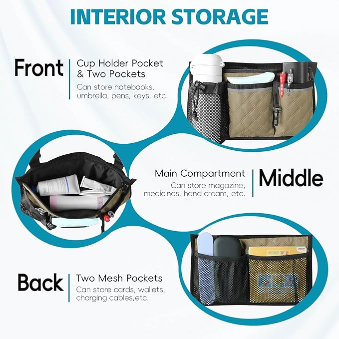 - 【Spacious & Organized Design】: Features a large main compartment for organizing your necessities, plus multiple front pockets and back mesh pockets. Perfect wheelchair organizer for personal items, medication, water bottles, phone, keys, glasses, pens, keeping essentials tidy and accessible.