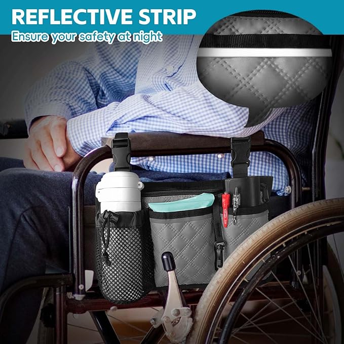 - 【Spacious & Organized Design】: Features a large main compartment for organizing your necessities, plus multiple front pockets and back mesh pockets. Perfect wheelchair organizer for personal items, medication, water bottles, phone, keys, glasses, pens, keeping essentials tidy and accessible.