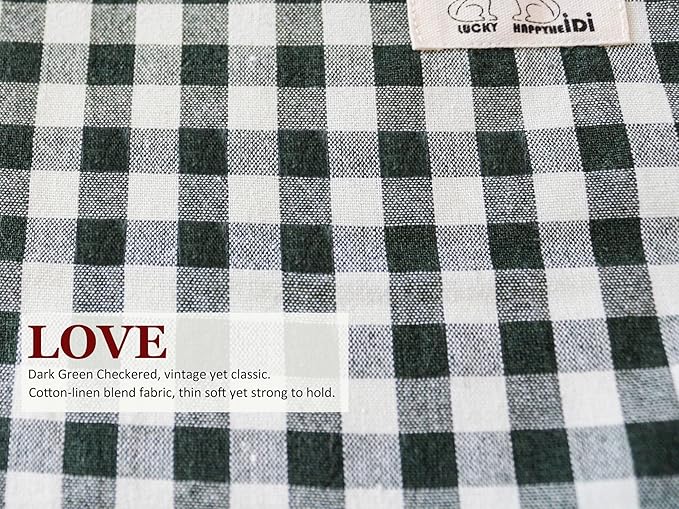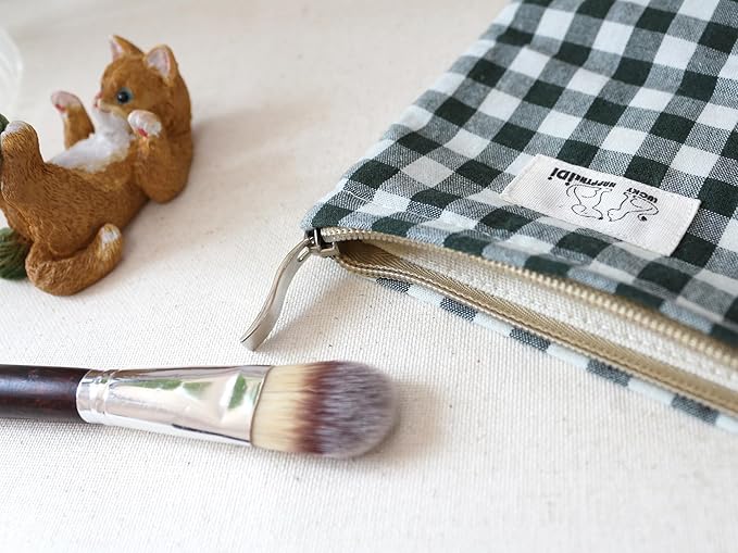 HAPPYHEIDI Dark Green Gingham Pouch Cotton Makeup Bag Cosmetic Travel Make Up Purse Organizer, Zipper Closure, Canvas Lined, Vintage Moss Green