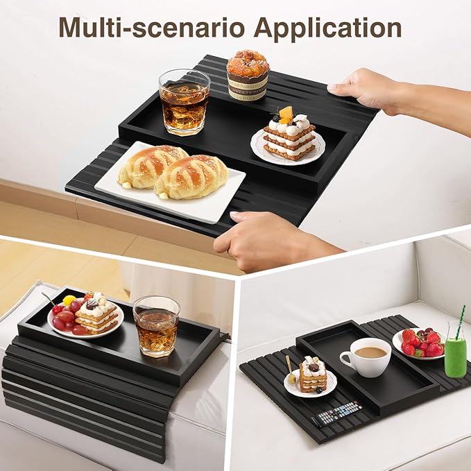 Couch Arm Tray, Bamboo Sofa Table for Couch, Sofa Armrest Tray Table, Anti-Slip Armrest Organizer, Foldable Couch Cup Holder for Snacks, Phone, Control, Cups, Black